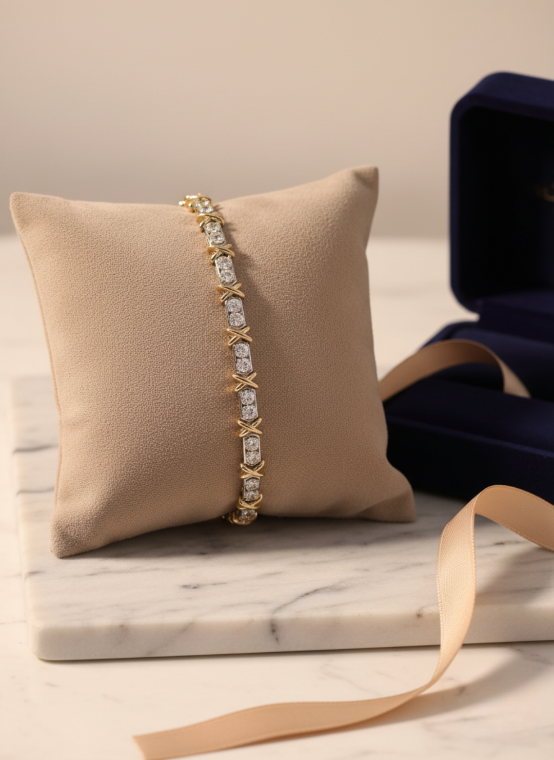 The design utilizes a sophisticated two-tone effect: the main body and structural "X" links are crafted in warm Yellow Gold (Specify Purity), while the diamond settings are made from cool White Gold to enhance the stones' natural color and fire. This contrast creates a rich, sophisticated texture. The stones are securely set to allow for maximum flexibility and comfortable wear, ensuring the bracelet drapes beautifully on the wrist. This piece is perfect for layering or wearing solo as a brilliant statement of classic, enduring luxury.