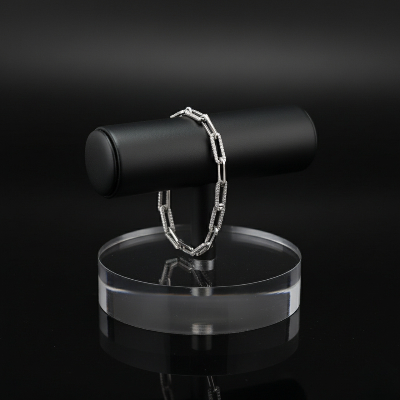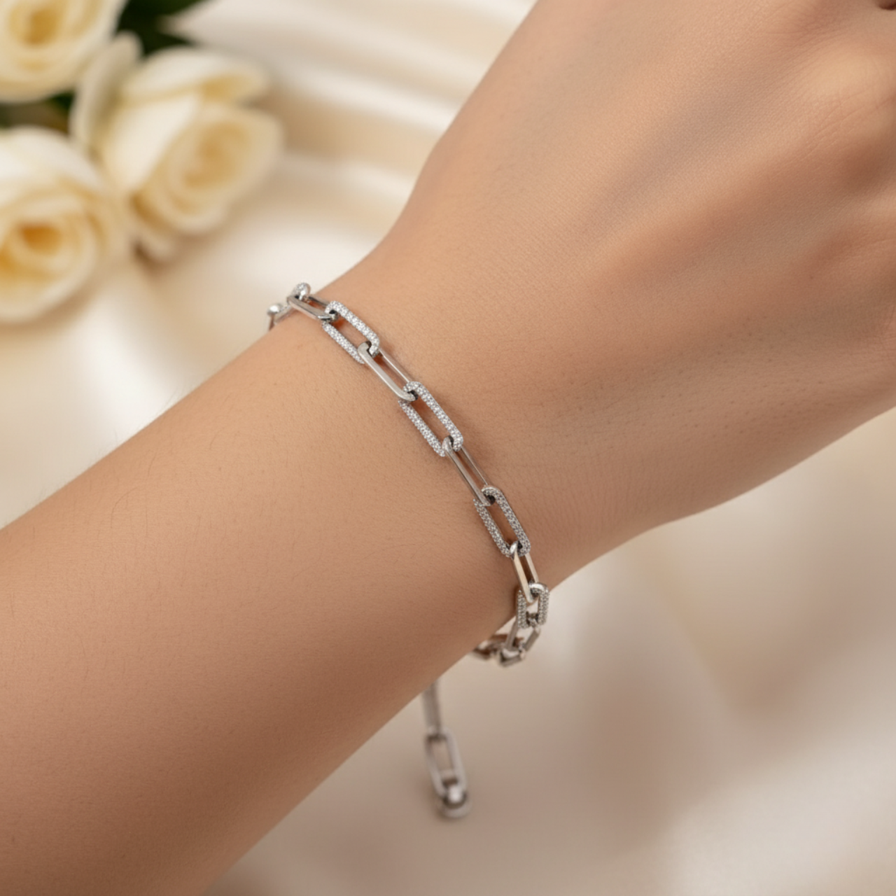 Make a bold, modern statement with The "Nova" Pavé Link Bracelet. This piece takes the popular paperclip chain trend and elevates it to luxury status. It features an interlocking chain of substantial, elongated oval links crafted from sleek White Gold (or Platinum).