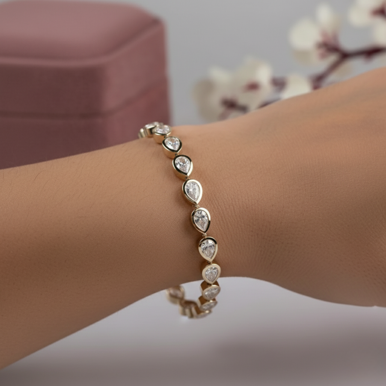 Inspired by vintage elegance and refined taste, The "Seraphina" Bracelet is a timeless piece that adds sophisticated luxury to any look. This exquisite line bracelet showcases a continuous row of brilliant Pear Cut Diamonds, spaced and linked perfectly to highlight the lustrous Yellow Gold setting.