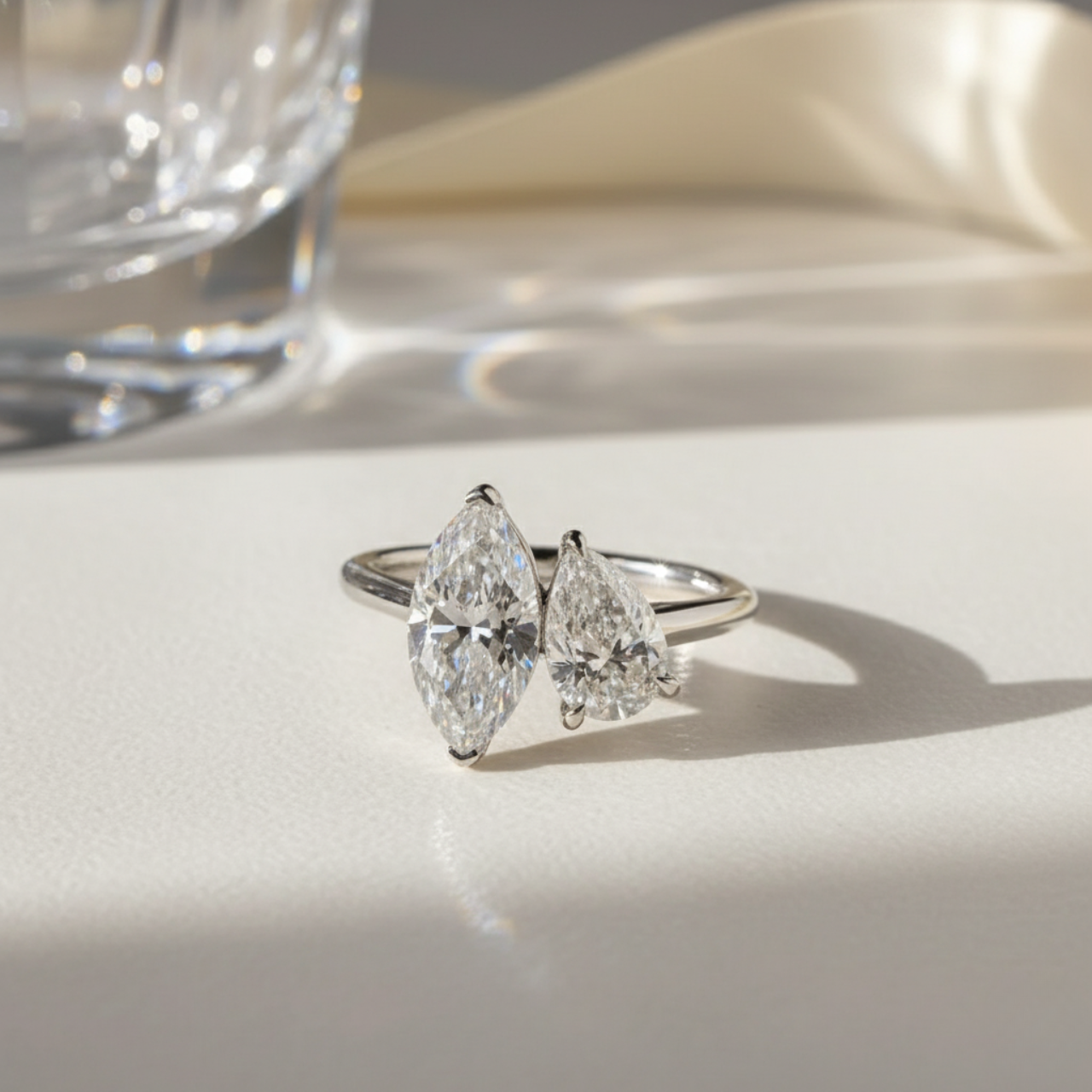 A powerful representation of two distinct individuals uniting, The "Intertwined Souls" Ring is a modern take on the classic Toi et Moi style. This stunning piece brings together the elongated grace of a Marquise Cut Diamond and the soft brilliance of a Pear Cut Diamond, symbolizing a perfect and harmonious partnership.