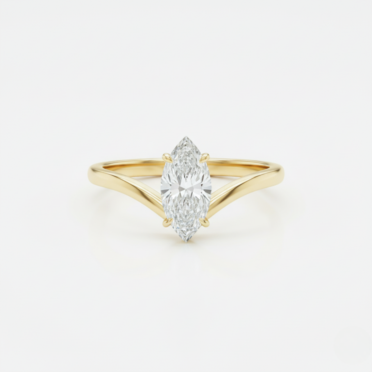 The central marquise diamond is secured by a clean V-prong at each point, offering both protection and an uninterrupted display of its elongated beauty. The smooth, polished Yellow Gold band elegantly splits and tapers, creating a graceful sculptural mount that lifts the diamond high. This modern setting allows maximum light to enter the stone, guaranteeing exceptional fire and sparkle. For the individual who values minimalist design and timeless elegance, the "Nova" is the perfect statement.