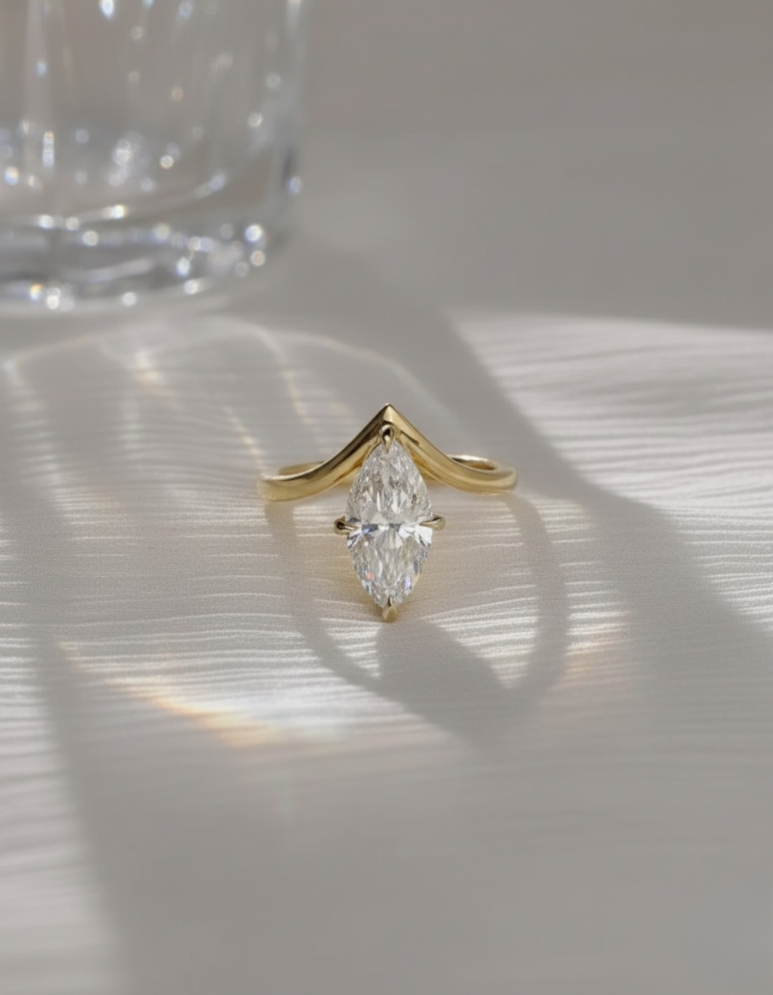 The "Nova" Solitaire captures the magnificent brilliance of the Marquise Cut Diamond in a design defined by pure, flowing lines. This ring is the essence of simplicity and sophistication, showcasing the diamond without distraction.